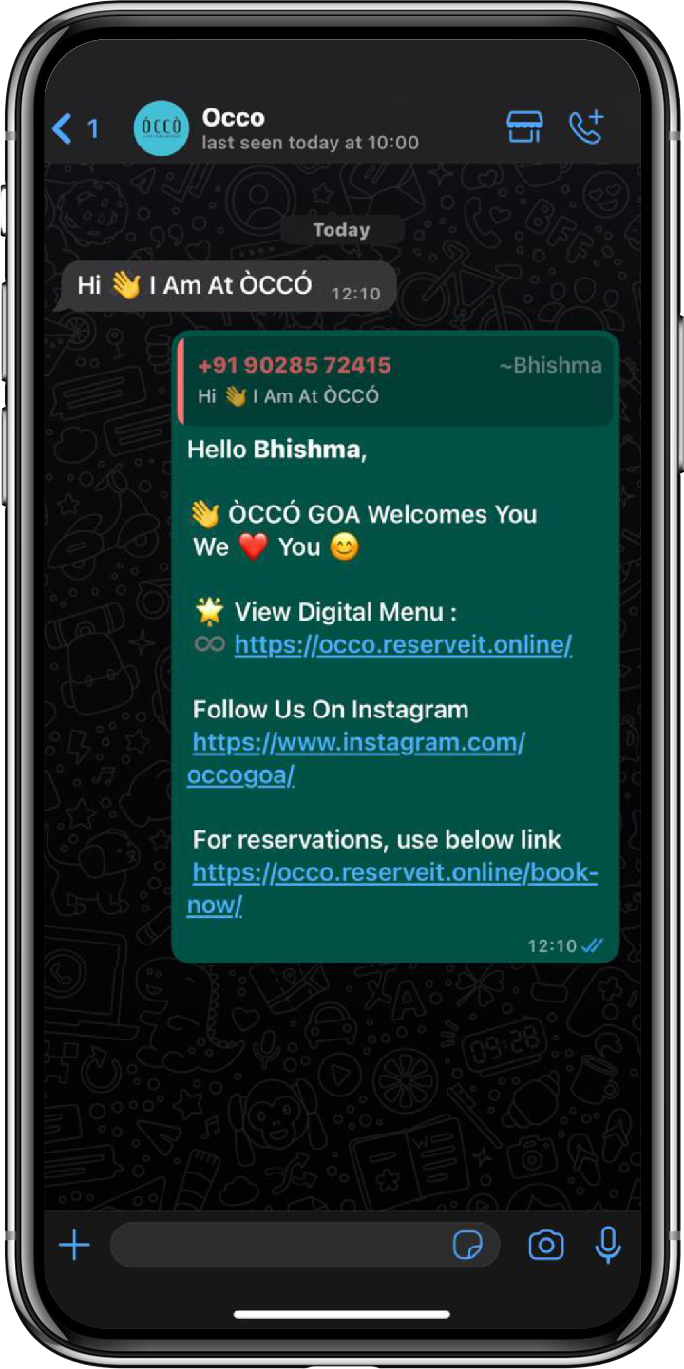 Within seconds, a message will be sent to your phone with a link to our digital menu. The WhatsApp bot will also inform you of restaurant specials and any relevant information.